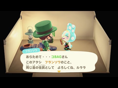 【あつ森】キャンプサイトに呼んだピティエに「アロマポット」をあげた/引っ越しが終わったペンタとセバスチャンの家行った/のぶおに「ボーンなドアプレート」のレシピ/島に引っ越してきたマロンの家に行ってみた