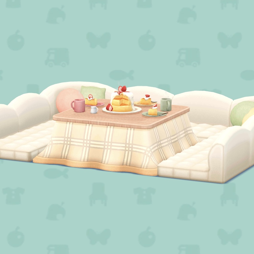 どうぶつの森 ポケットキャンプに登場する家具「ふわもコルームのこたつ」の入手方法、作成方法などをまとめています。