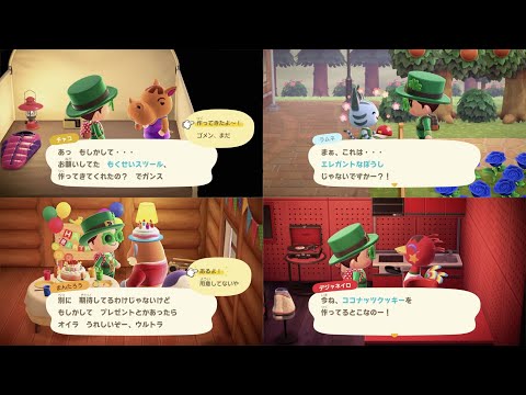 【あつ森】キャンプサイトに呼んだチャコに「もくせいスツール」をあげた/ラムネに「エレガントなぼうし」あげた/まんたろう の誕生日に家に行ってみた/デジャネイロに「ココナッツクッキー」のレシピをもらった