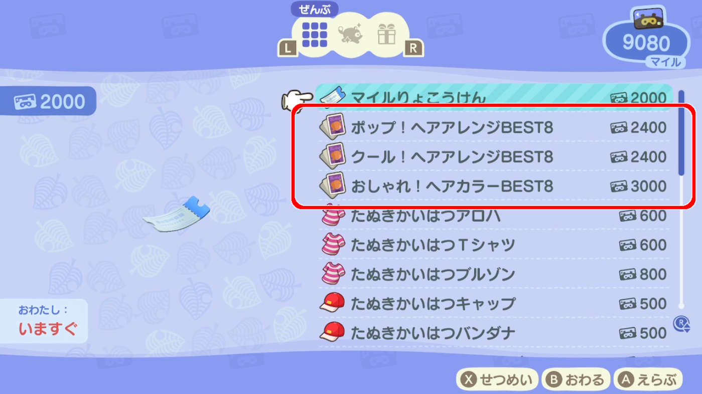マイル交換で特定のアイテムを入手すると、選択できる髪型・カラーの種類を増やすことができます。