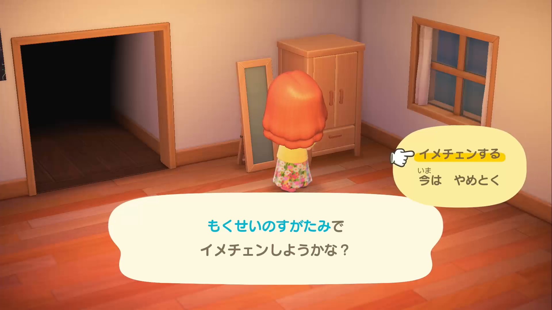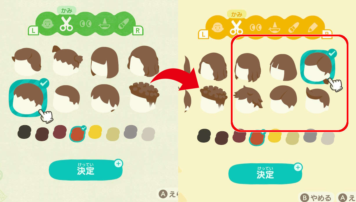 主人公の髪型はドレッサーや姿見など、鏡が付いている家具の前で「Aボタン」で変えられます。鏡の付いた家具はDIYレシピを入手することで作成できるほか、タヌキ商店で販売されることもあります。