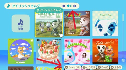 また、1曲をループ再生だけではなく、「Yボタン」でシャッフル再生することも可能です。曲名の隣で音量調節も可能です。