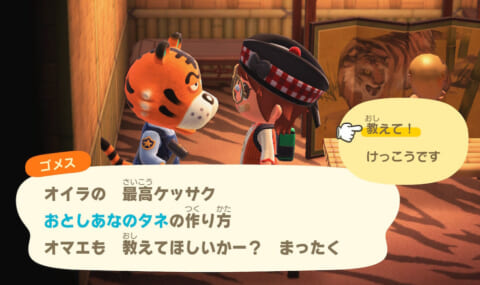 DIYレシピの習得数が100以上である必要があります。レシピを100以上覚えたうえで、毎日住人のだれかがDIYをしているので、ハキハキ(オイラ系)の住人が「おとしあなのタネ」を作るのを根気よく待つ必要があります。
