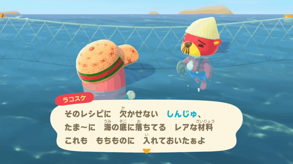 ラコスケの話では、レシピに必要な「 しんじゅ 」は海の底で採れるレアな素材で、ラコスケも探してくれるとの事です。