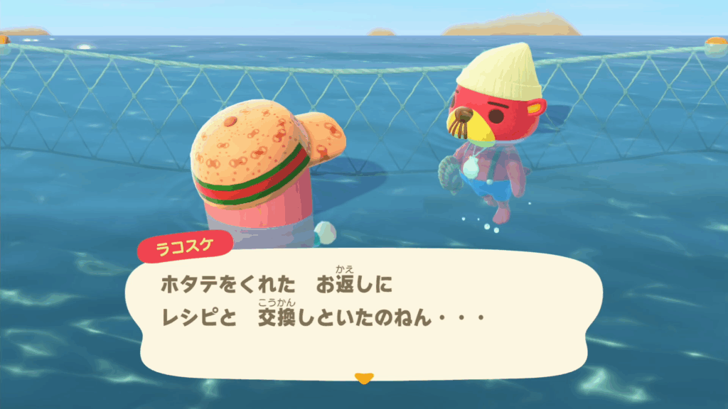 ホタテを渡すと、マーメイド家具やDIYレシピ・しんじゅと交換してくれるので、集めている方は渡すことをおすすめします。何と交換してくれるかはランダムになるため、マーメイド関連アイテムをコンプリートするには時間がかかります。