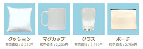 追加アイテムは、「グラス」「マグカップ」「ポーチ」「クッション」の4種類があります。