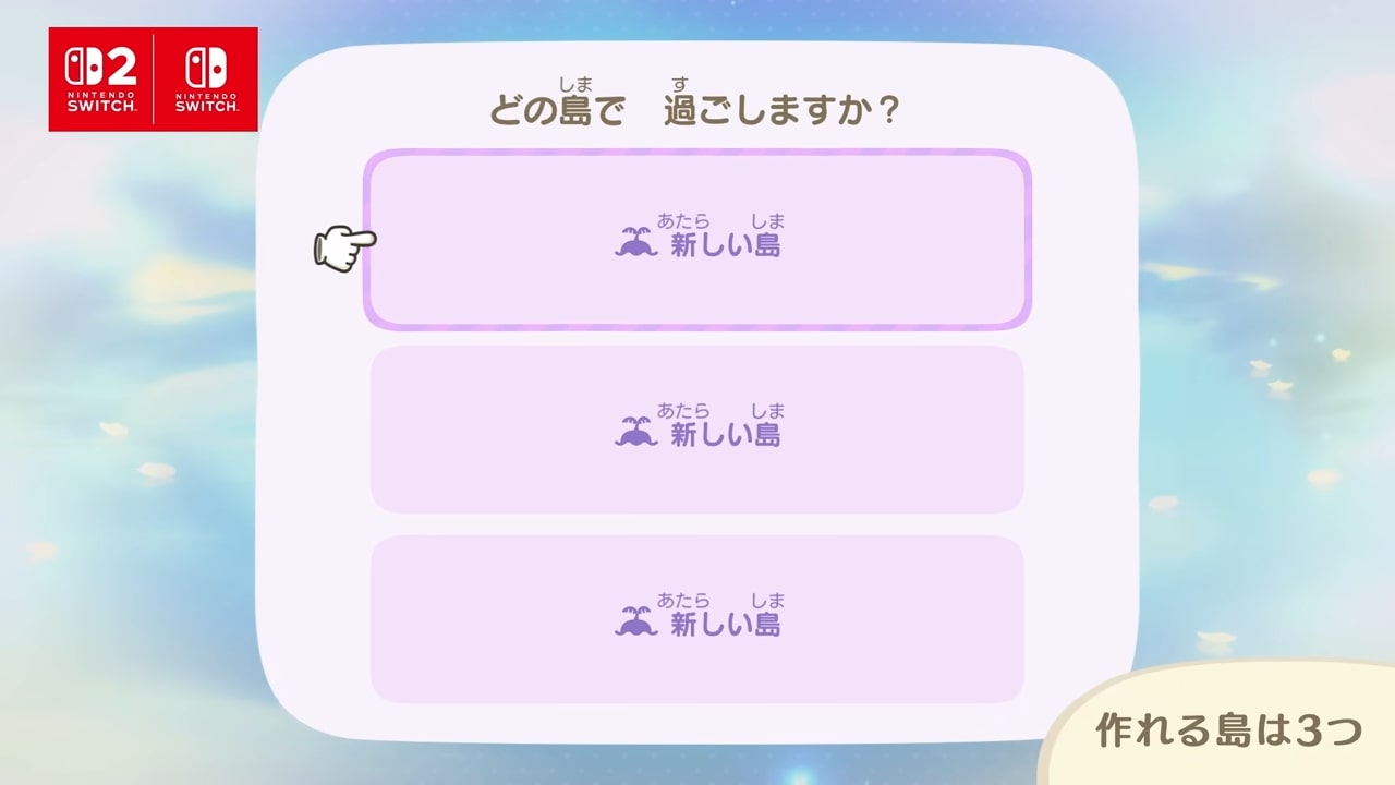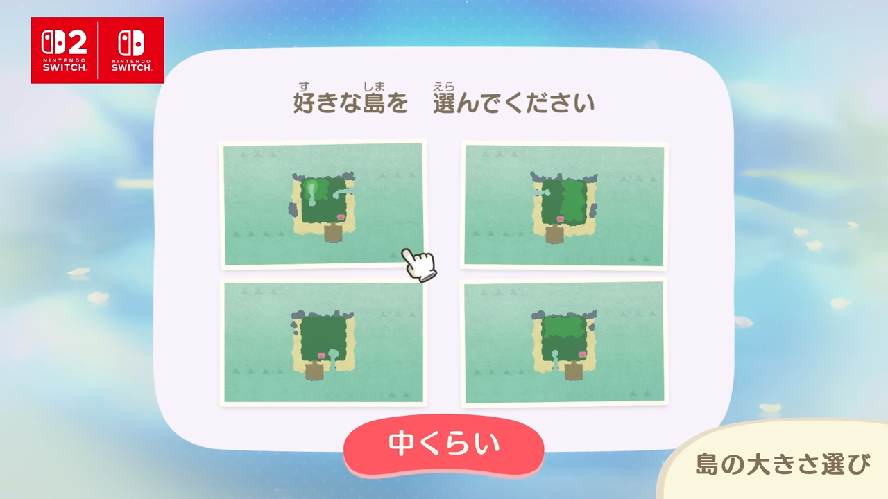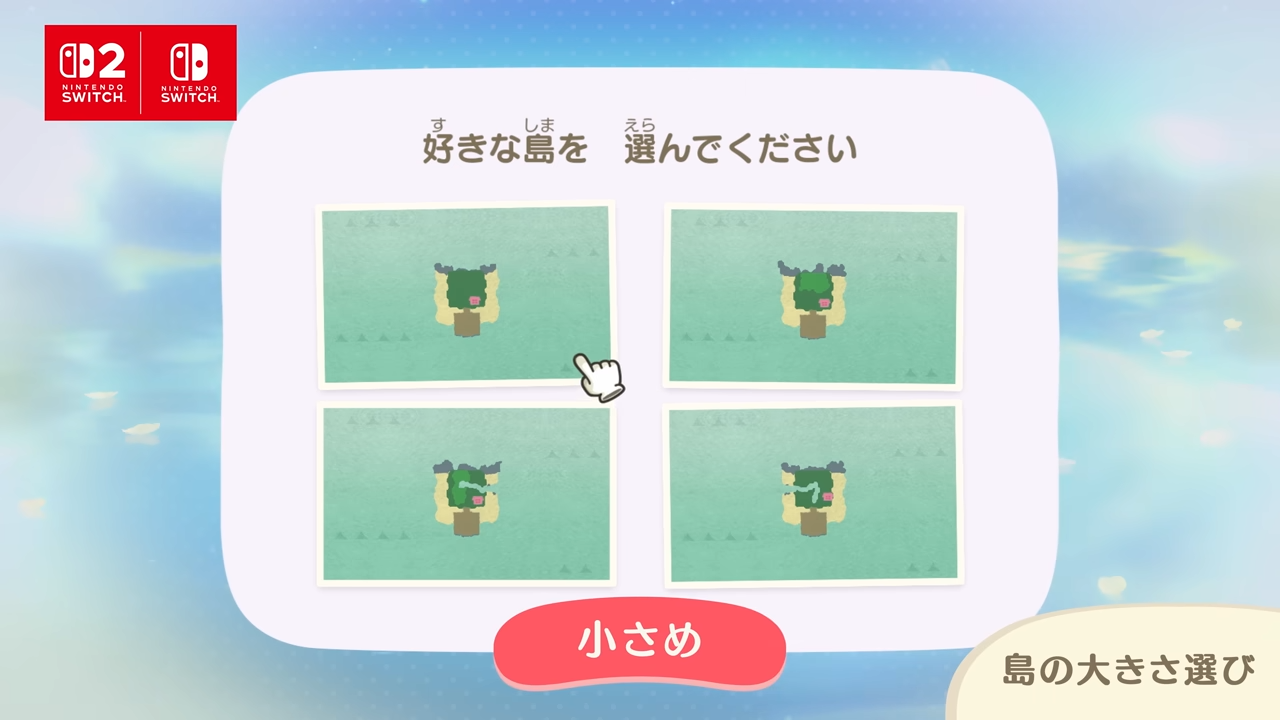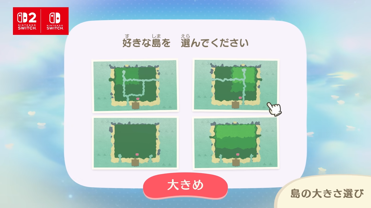 島のサイズは「小さめ」「中くらい」「大きめ」から選べ、最大で1人3つの夢の島を持つことができます。さらに、島の形や地形の異なる候補から好きなタイプを選べるようになっており、