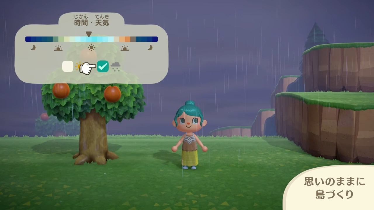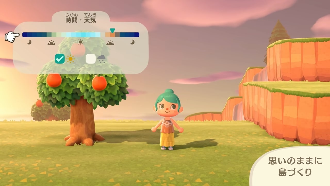 - 時間と天候を固定できるため、好きな時間帯のままでずっと遊べます。