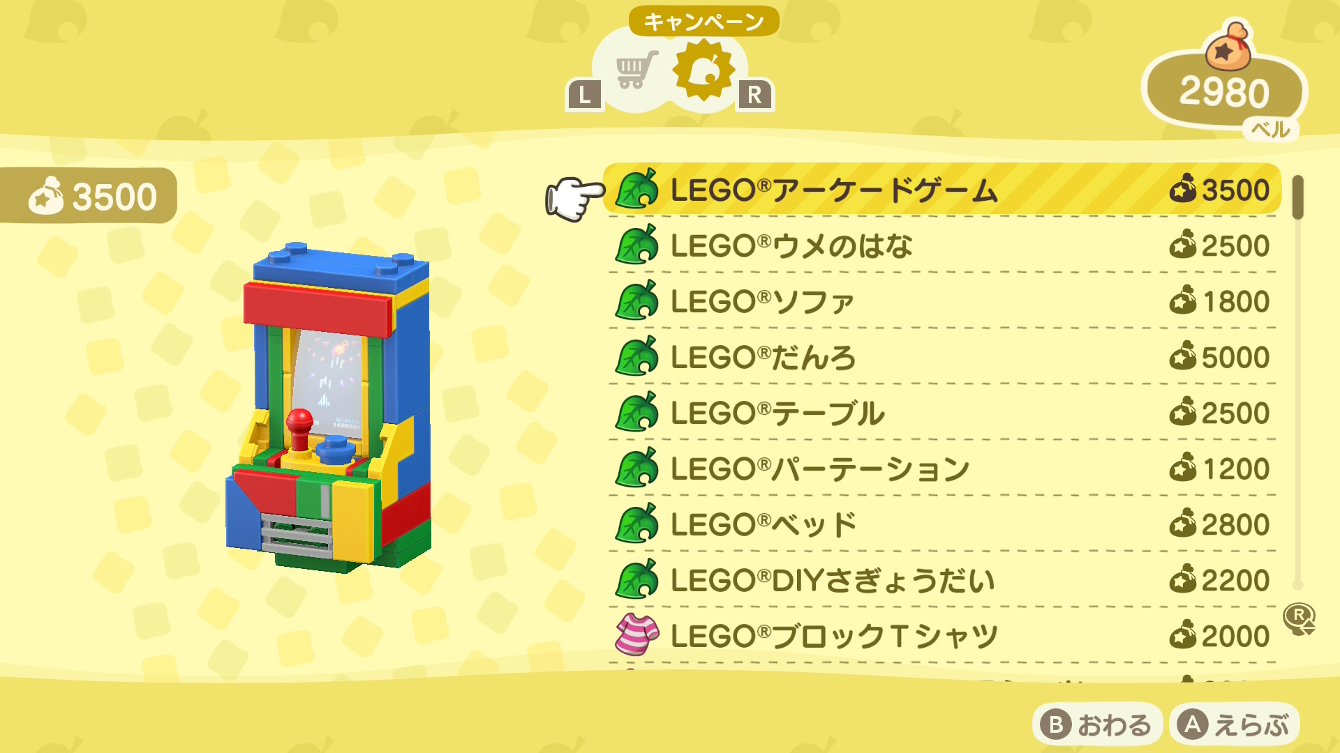 2026年1月14日(水)に配信されたVer.3.0から「たぬきショッピング」の「キャンペーン」にてレゴコラボの家具と洋服が購入できるようになりました。