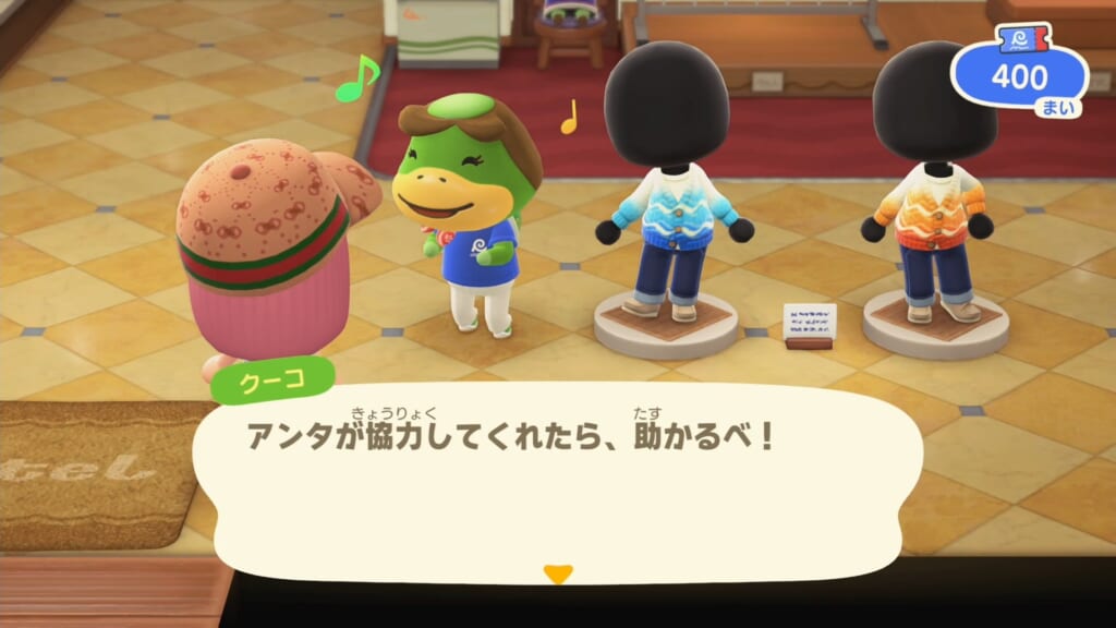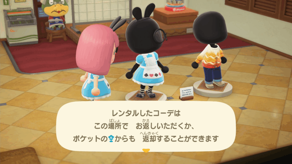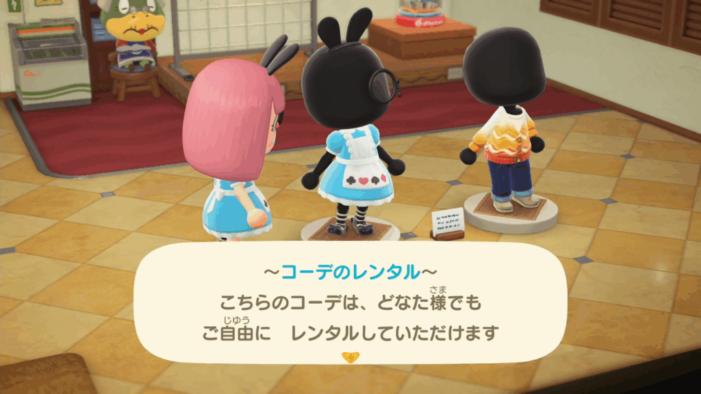 どうぶつたちはもちろん、通信プレイで遊びに来たフレンドも、飾られているレンタルコーデを着ることができます。