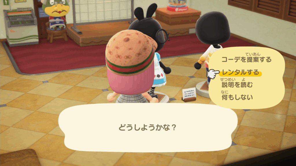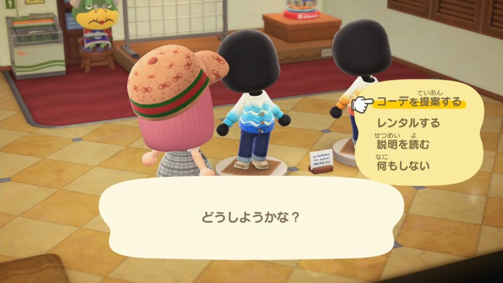 レンタルコーデのマネキンの前でAボタンを押し、「コーデを提案する」を選択することでレンタルコーデを設定できます。