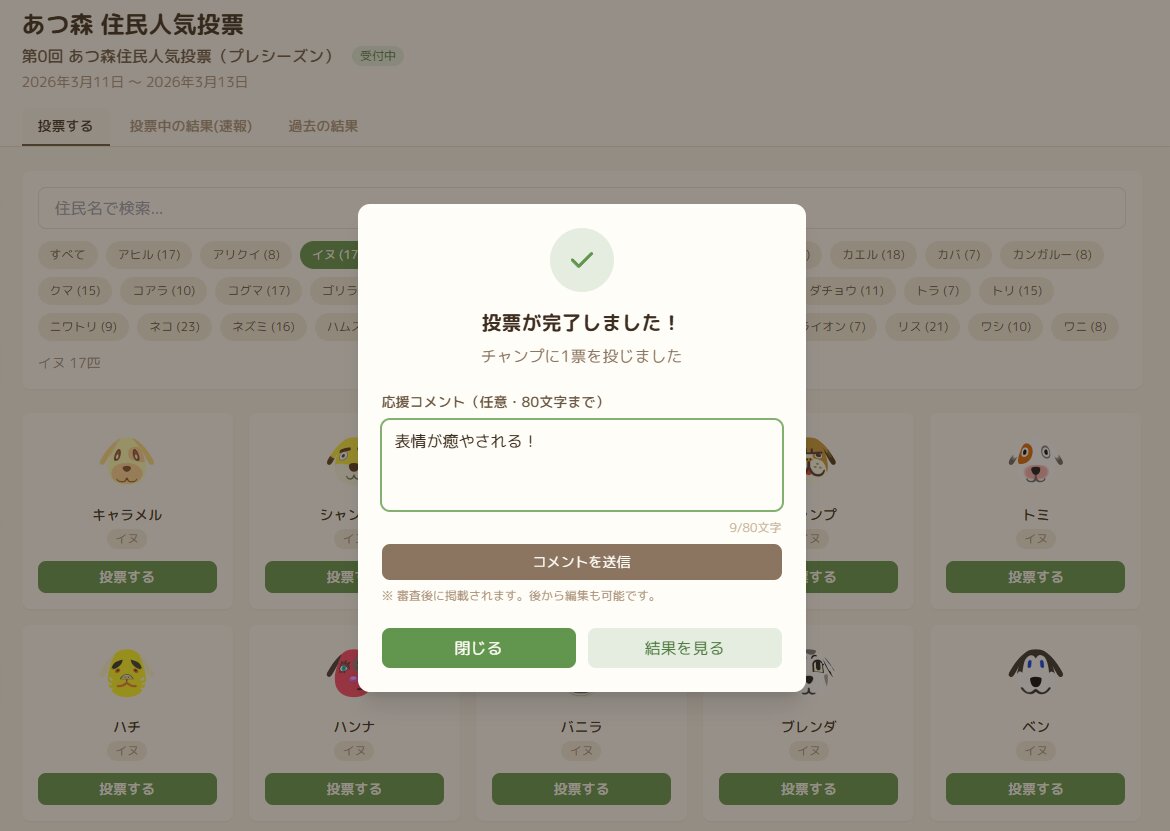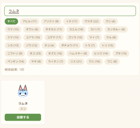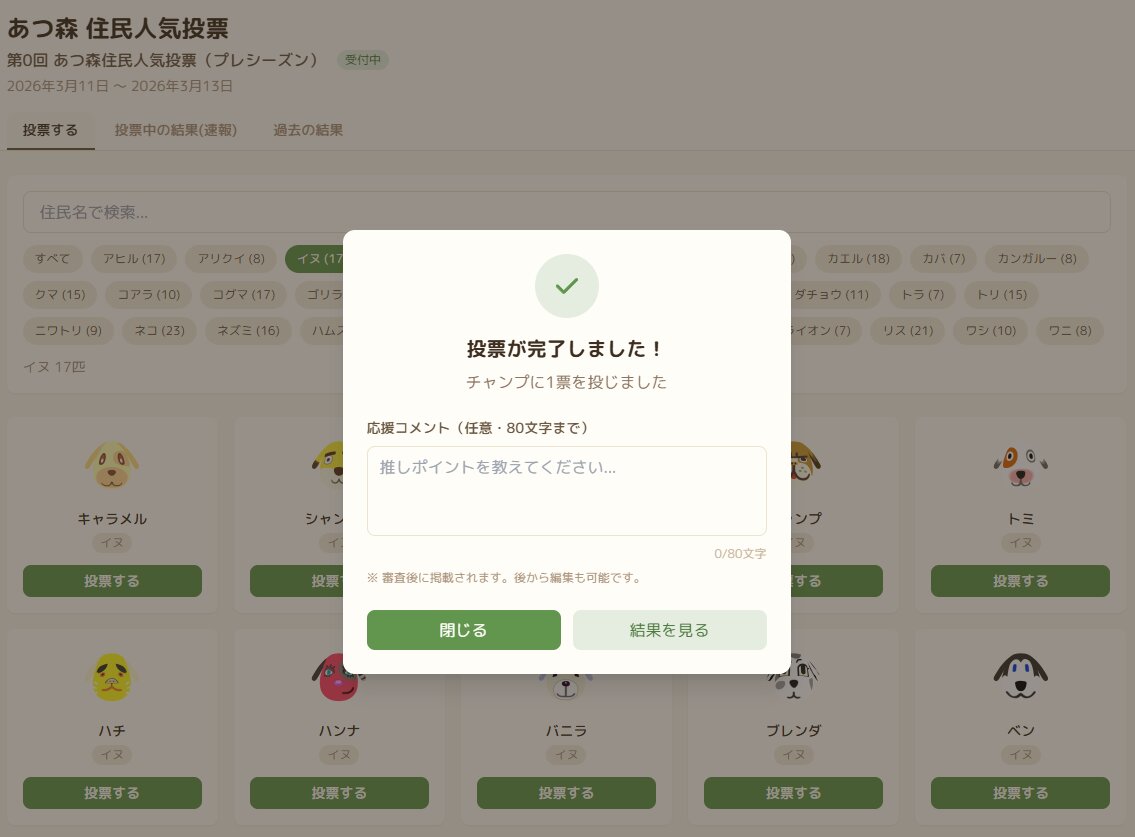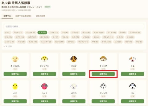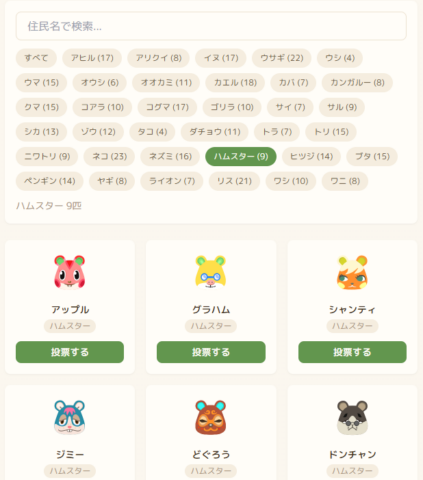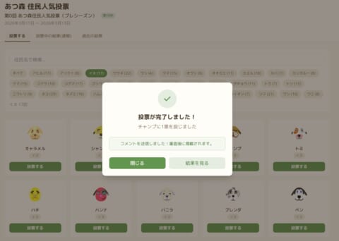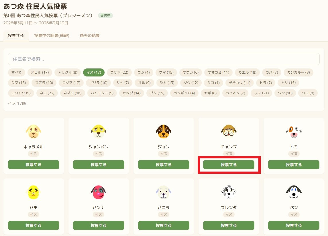 お気に入りの住民が見つかったら「投票する」を押して投票してください。