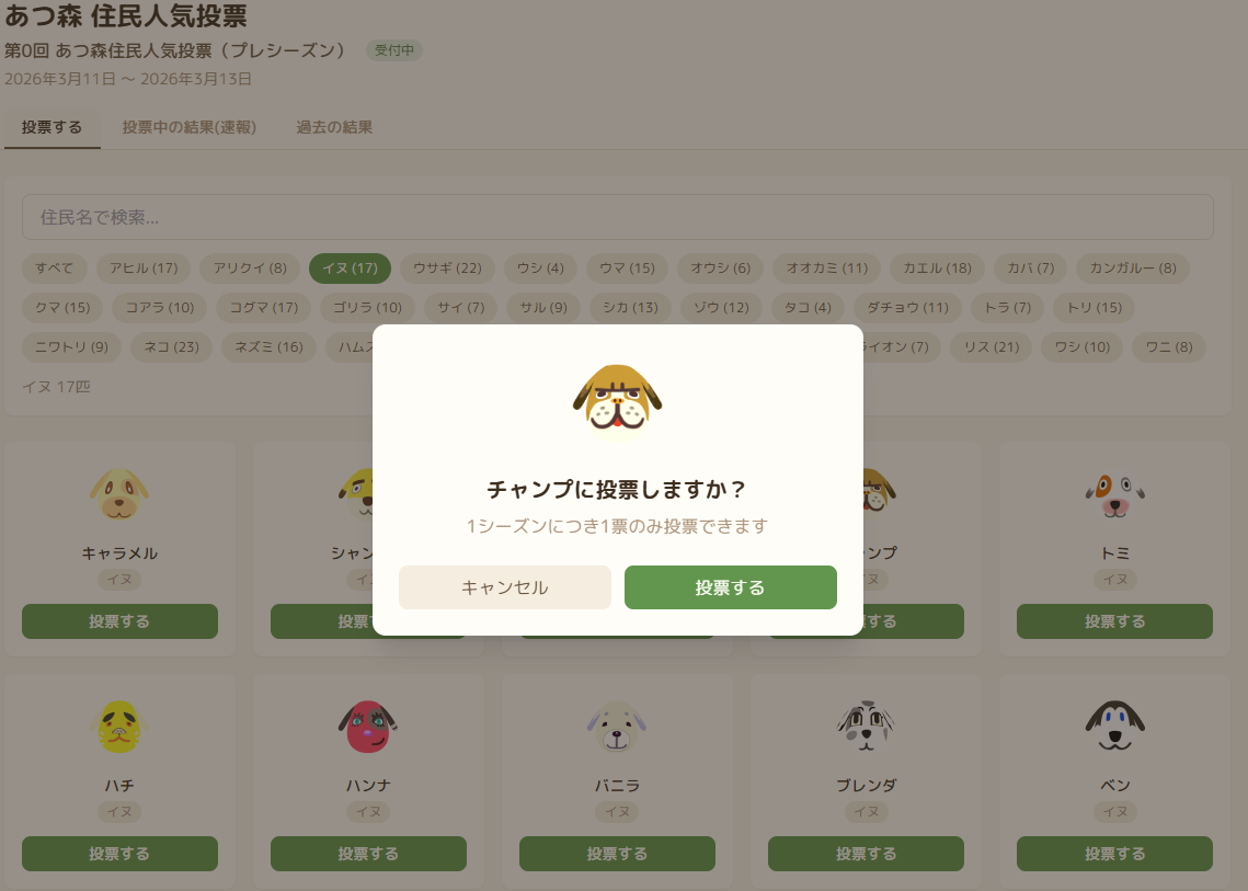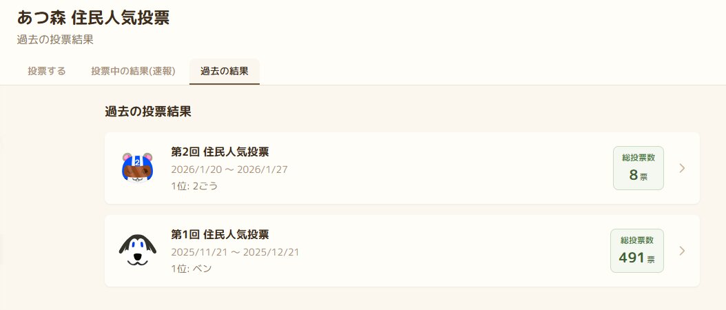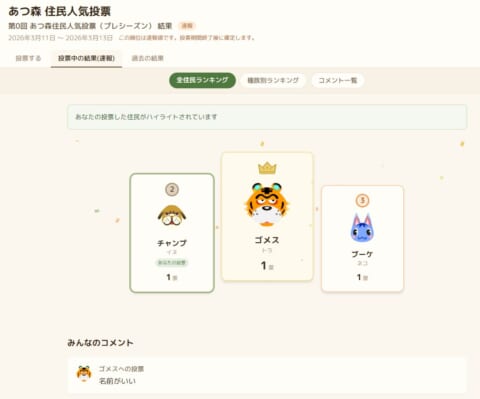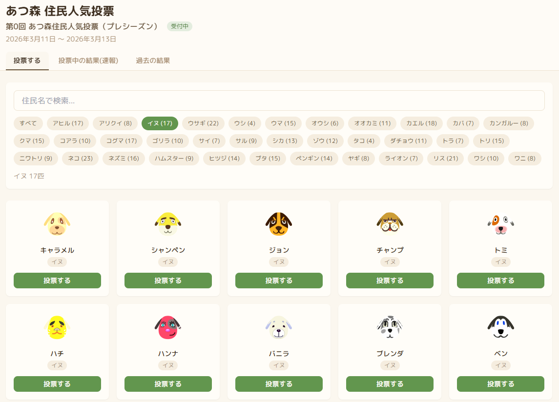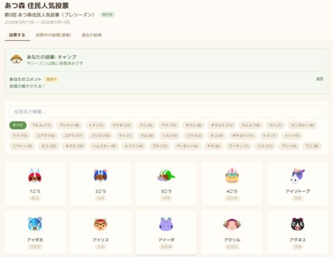 あつ森の登場キャラの人気投票ツールが新しくなりました。以前の人気投票よりも住民が探しやすく、投票後も結果を楽しめます。