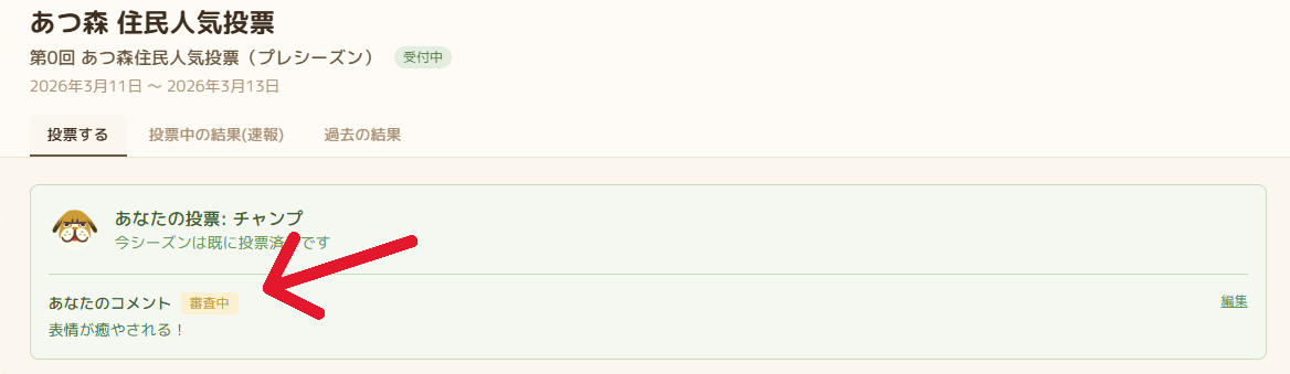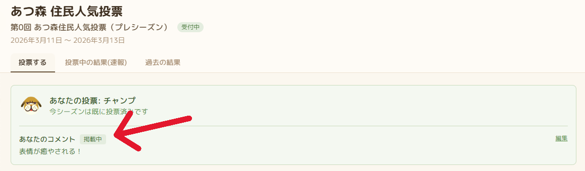 結果は、シーズン中でも「投票中の結果(速報)」として見ることができます。現在の順位・投票数、応援コメントも確認することが可能です。