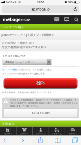 1)モバコインの購入方法で「Mobageモバコインカード」を選択すると、以下の画面が表示されます。
