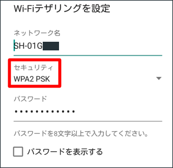 セキュリティの種類を選択するとパスワードの入力画面が表示されます。スマホ画面の「パスワードを表示する」の横にあるチェックボックスをタップするとパスワードが表示されますので、表示されたパスワードを入力してください。