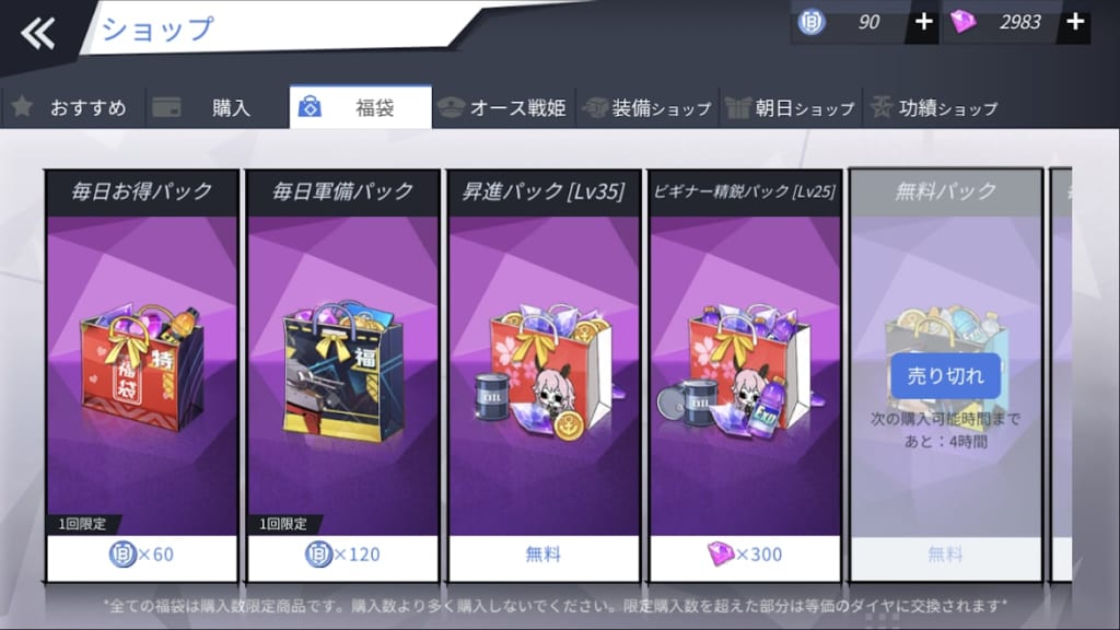 ショップにある福袋コーナーには、毎日無料で買えるもの・一定の指揮官レベルに達した時に無料・ダイヤで買えるものなどがあるので見逃さないようにしましょう。