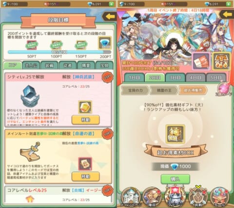 序盤~中盤は、コアレベルが1~2個上がるごとに新たな育成要素・機能・コンテンツなどが続々と開放されていき、そのたびに戦力も大幅に上げられるようになります。