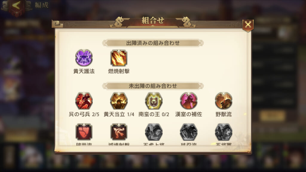 課金などをしていて主将が充分に揃っている場合には、特定の「組み合わせ」による追加効果などを意識した編成にしてみるのがオススメ。