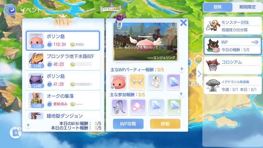 MVPボスの討伐に参加すると、1日5回まで参加報酬がもらえます。エンジェリングやデビルリングなどはポリン島に出現します。「イベント」タブの「MVP」の場所で次の出現時間がわかりますので、時間が近づいたら「移動」ボタンで現地に移動してみてください。