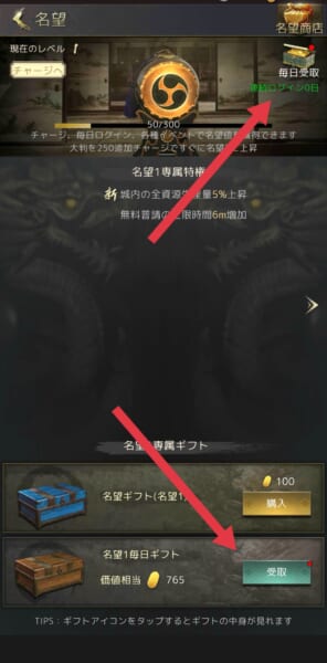 ホーム画面左上アイコン横「名望」→『毎日受取』から、『名望値』を受け取れます。