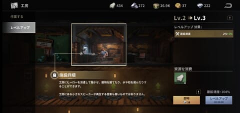 また「工房」は、レベルアップすることで建設速度を上げられます。