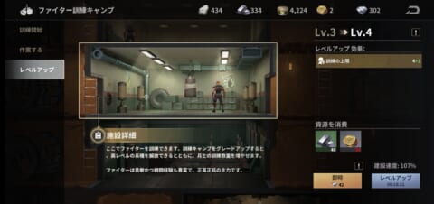 - その他レベル上げを優先すべき施設は「レストラン」「実験室」「各兵士の訓練キャンプ」「工房」
