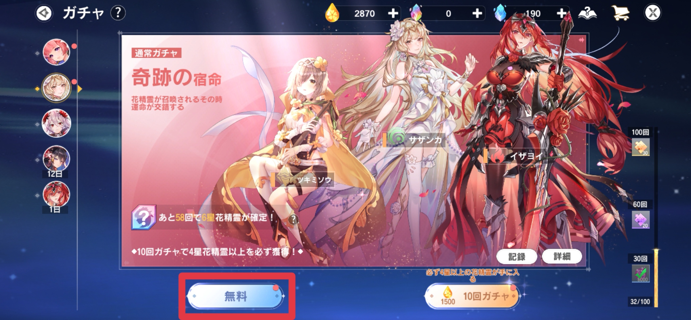 通常ガチャ「奇跡の宿命」は1日1回無料で引けるため、引くのを忘れずに!