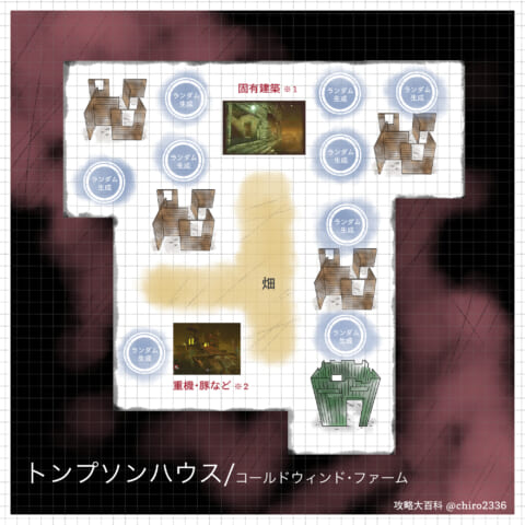 どのマップにも(屋内を除く)1つ存在する小屋。地下室はこの小屋か固有建築のどちらかに生成されます。 |