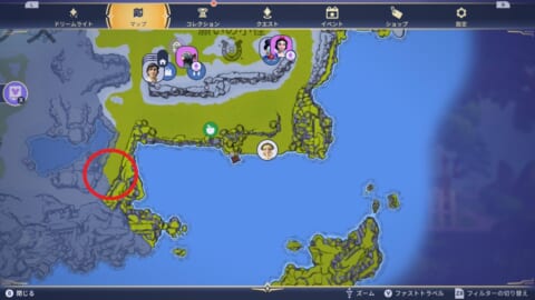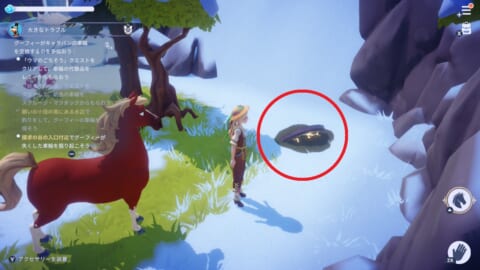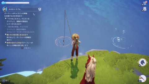 - 願いの小径の南にある水辺で釣りをしてグーフィーの車輪×1を釣り上げる
