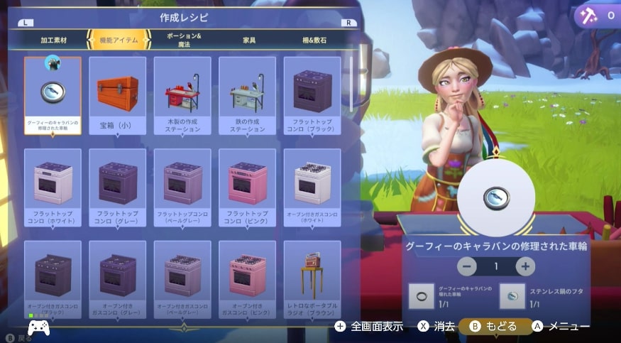 グーフィーのキャラバンの修理された車輪のレシピは【機能アイテム】の欄にあります。