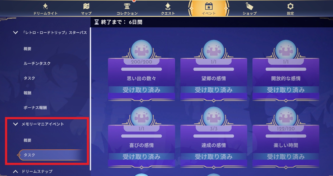タスクは「イベント」欄で確認できます。アイテムを拾ってキオクを集めるタスクと、対象の村人と「一緒に過ごそう!」をすると完了するタスクがあります。