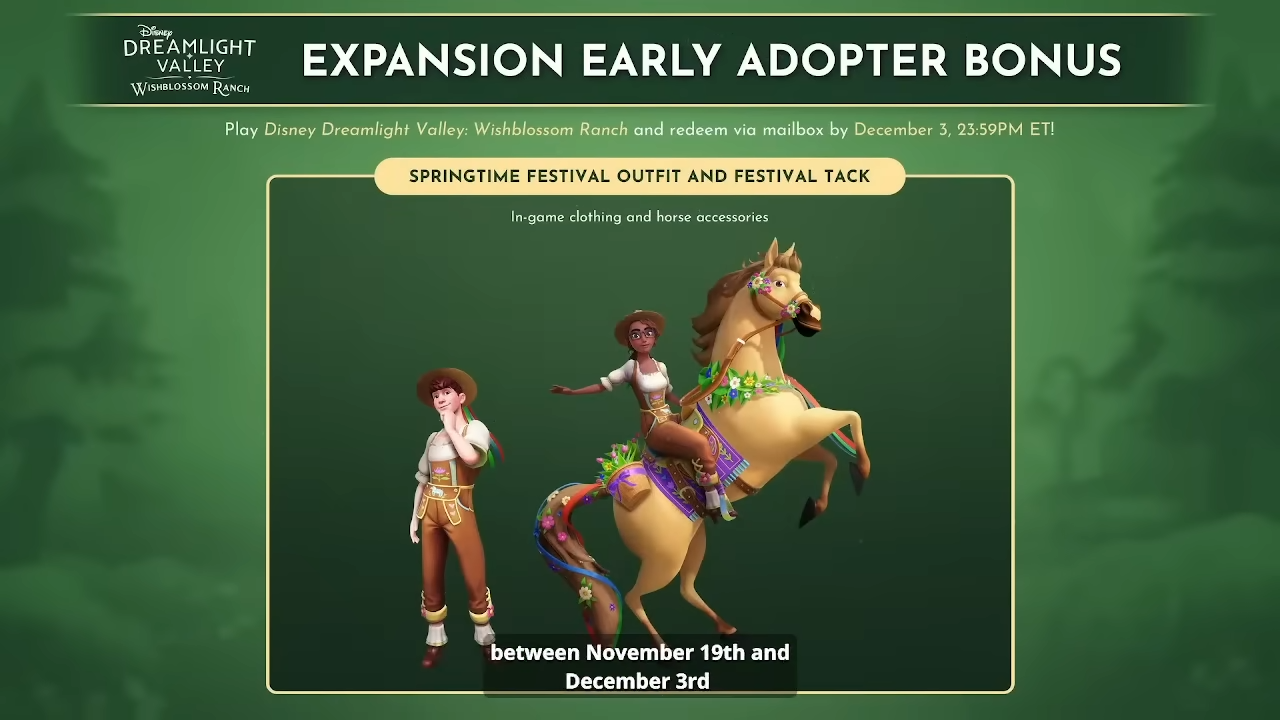 2025年11月19日~12月3日までに「願い咲く牧場」拡張パックを含むいずれかのエディションを購入したプレイヤーには、限定特典がゲーム内郵便ポストに届きます。