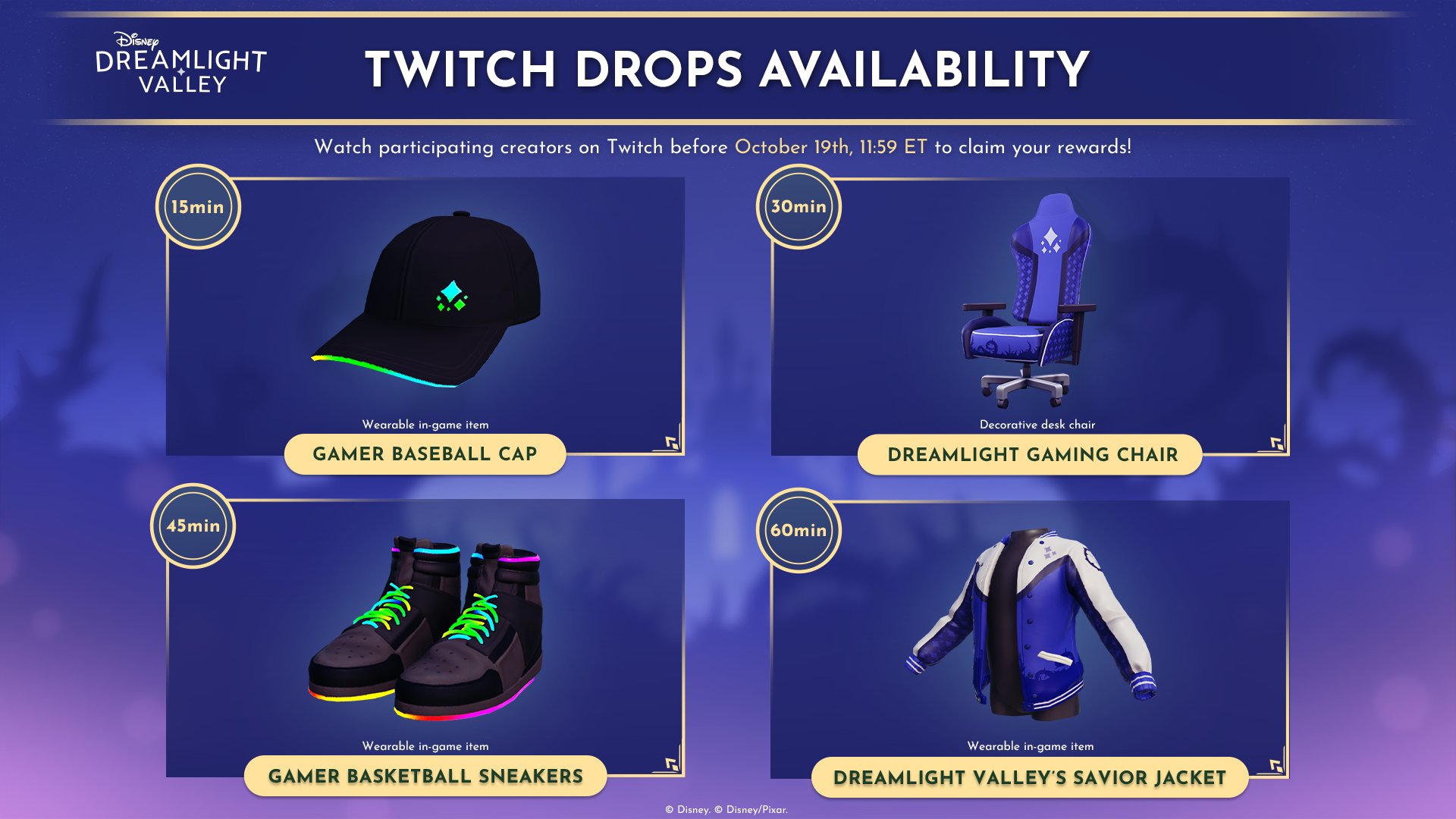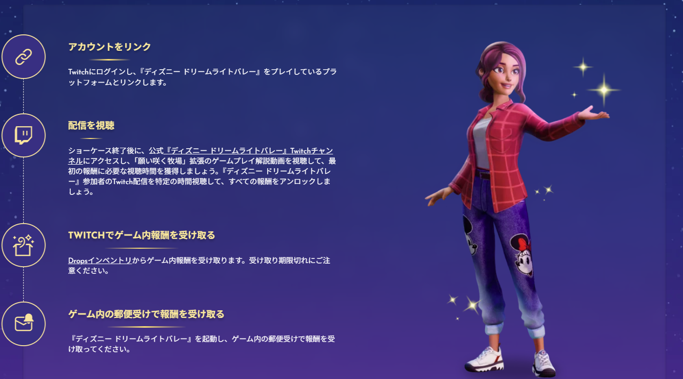 米国時間10月15日 (日本時間:2025年10月16日 木)に配信される「ショーケース」終了後から、公式『ディズニー ドリームライトバレー』Twitchチャンネルにアクセスし、「願い咲く牧場」拡張のゲームプレイ解説動画または、Twitchで『ディズニー ドリームライトバレー』に参加中の配信者の動画を、特定の時間視聴して報酬のDropsを獲得しましょう!