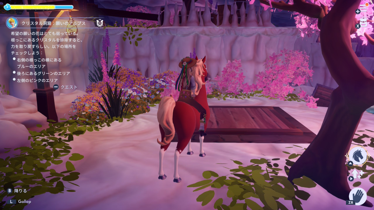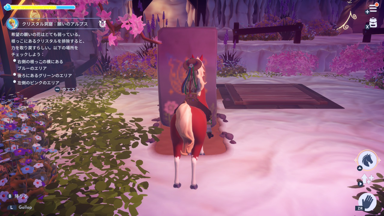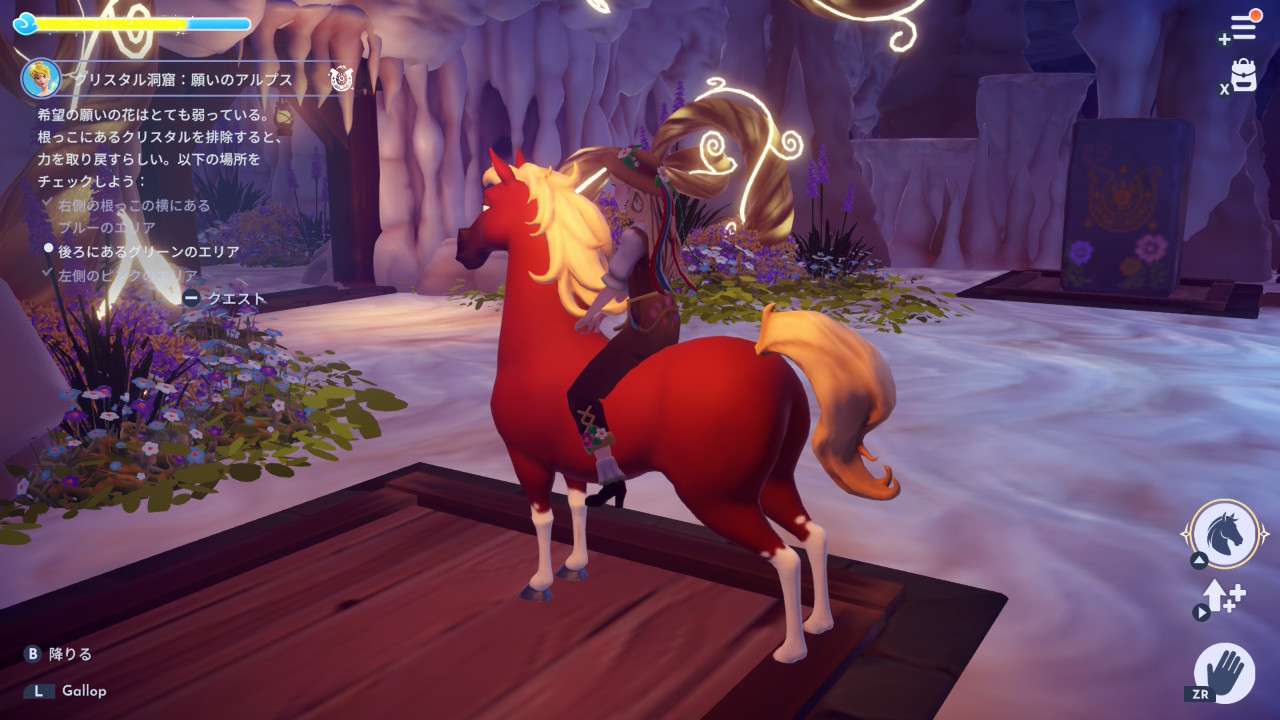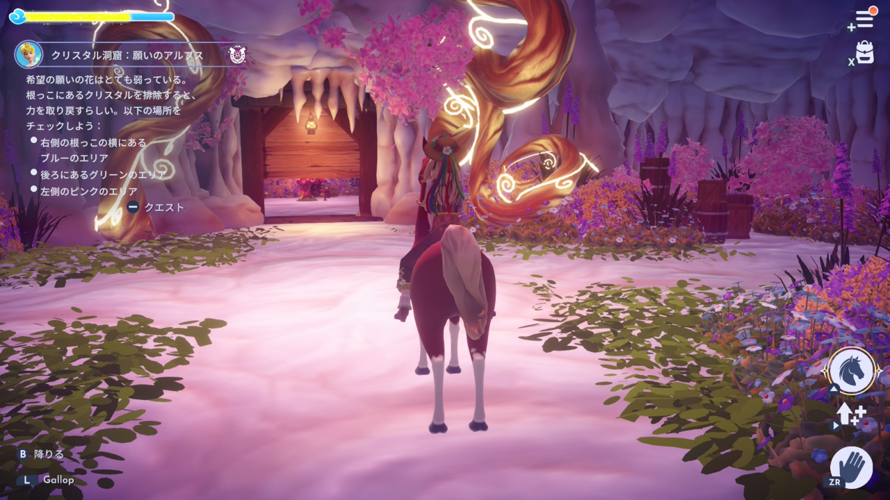 - 希望の願いの花の根っこの右側・左側・後ろのエリアのクリスタルをウマで破壊する