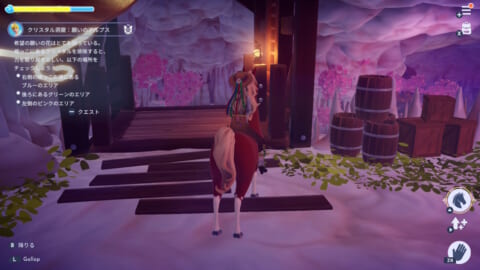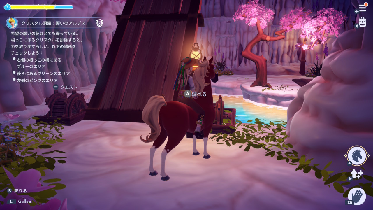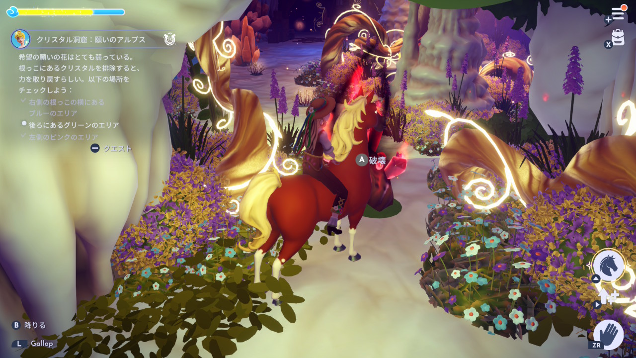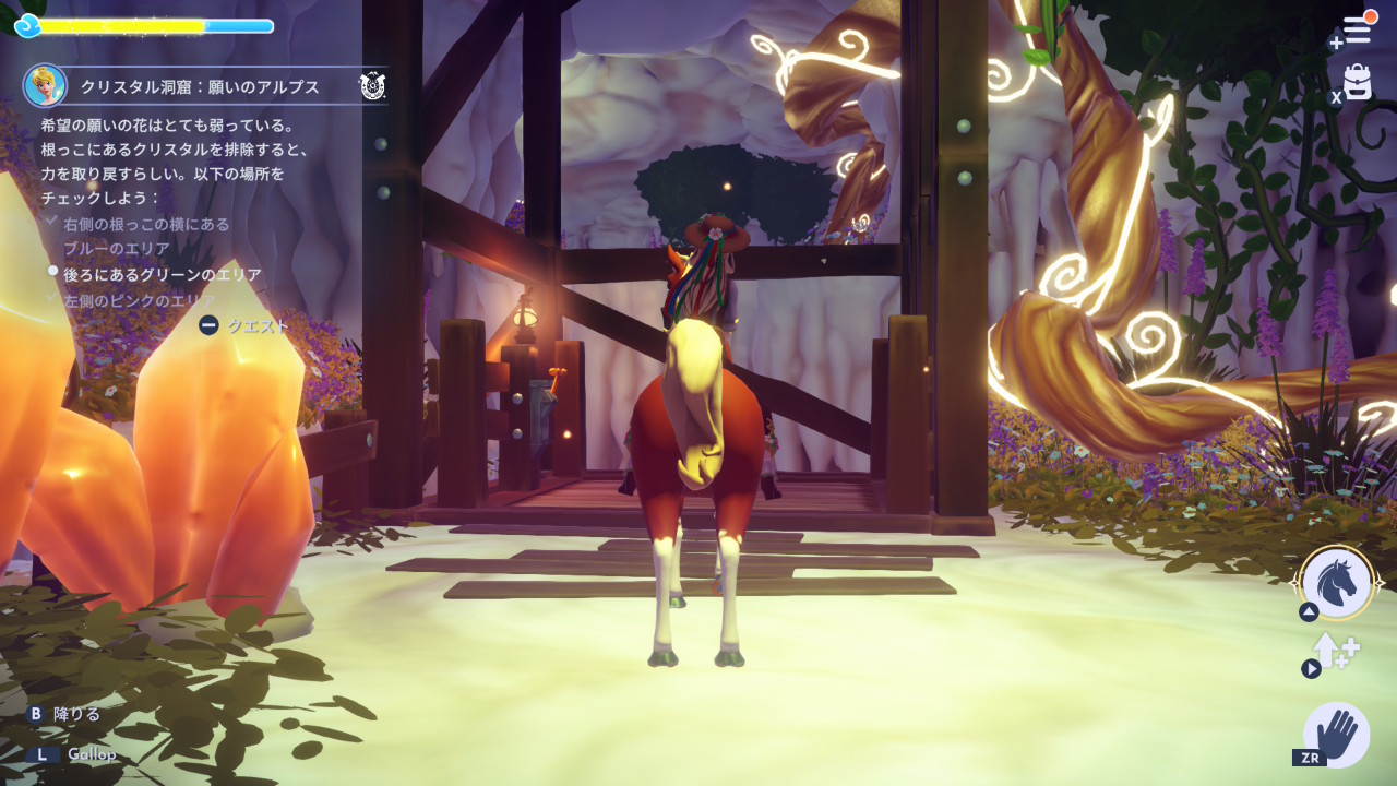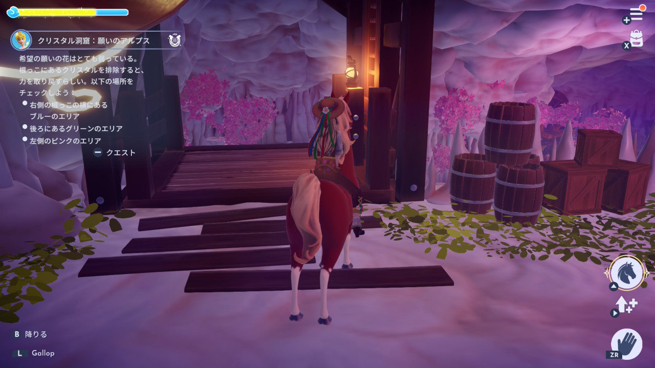 - 希望の願いの花の根っこの右側・左側・後ろのエリアのクリスタルをウマで破壊する