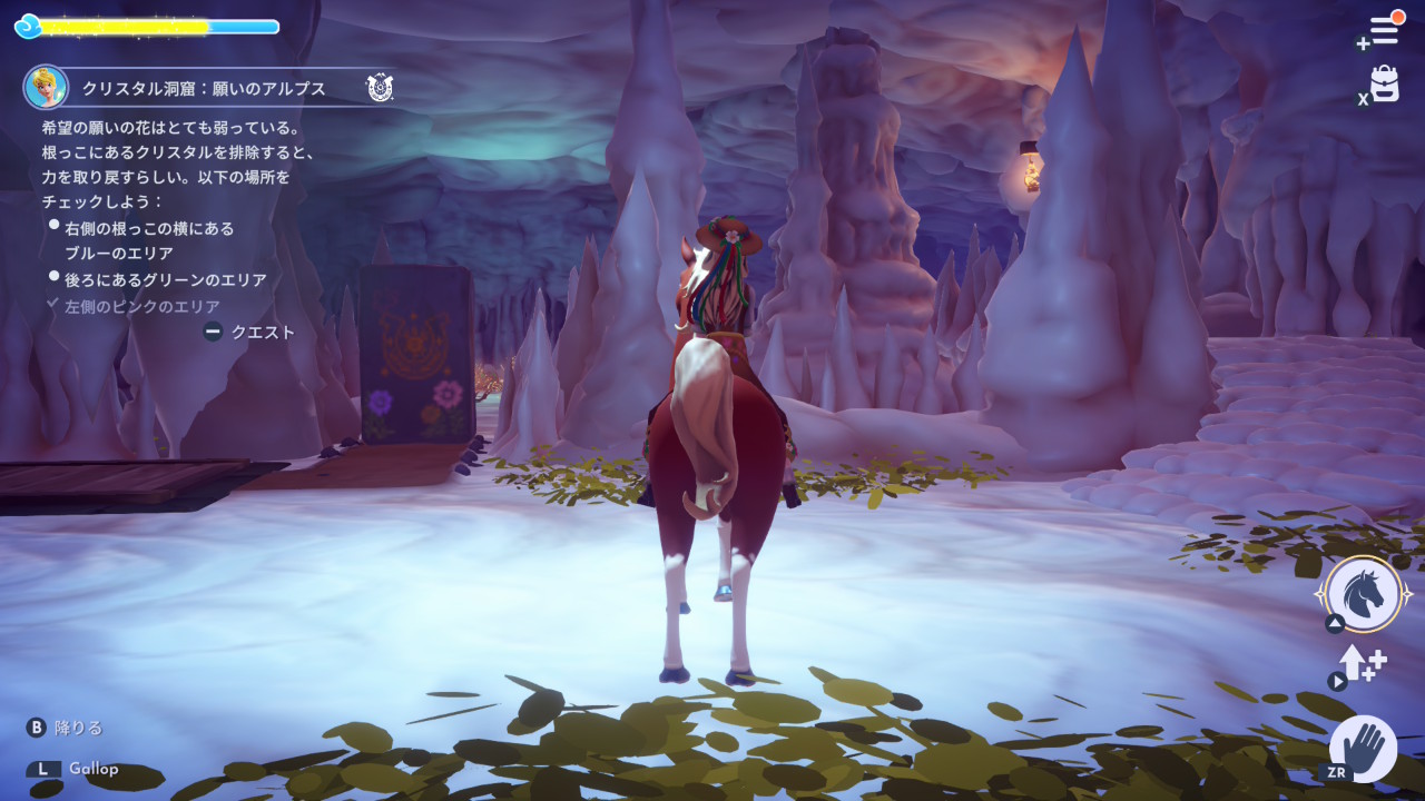 - マキシマスに乗って、クリスタル洞窟を出て願いの花のココロに戻る(川などを飛び越えて近道をしてください)