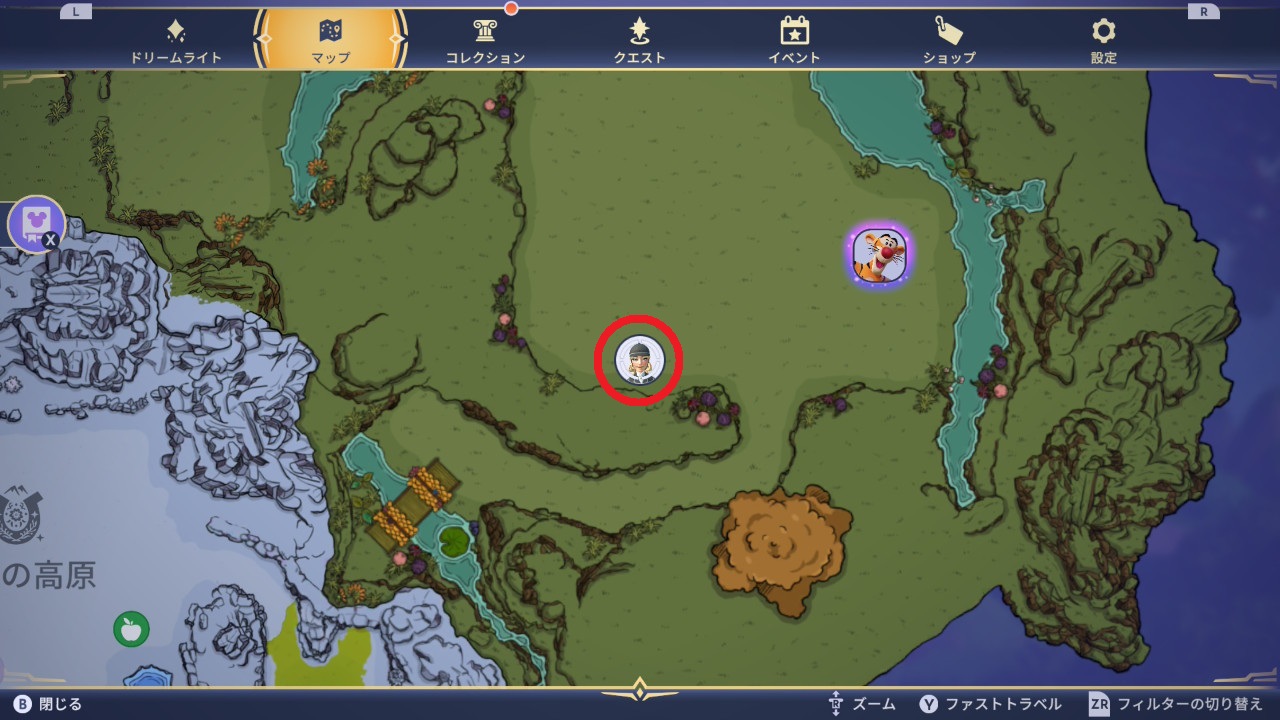 ティガーには、ティンカー・ベルのストーリークエスト「クリスタル洞窟:虚飾の渓谷」をクリアした後、ティガーのクエスト「下ではなく、上にジャンプ」を進めることで会えます。