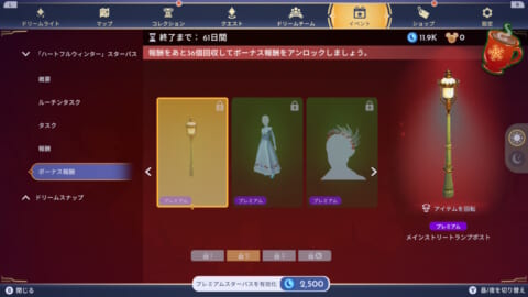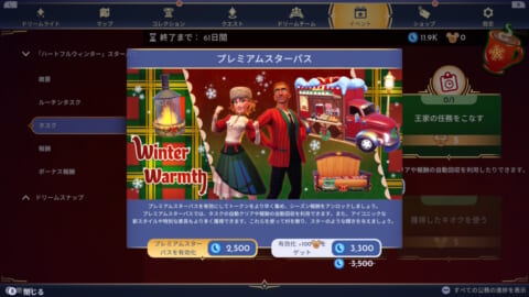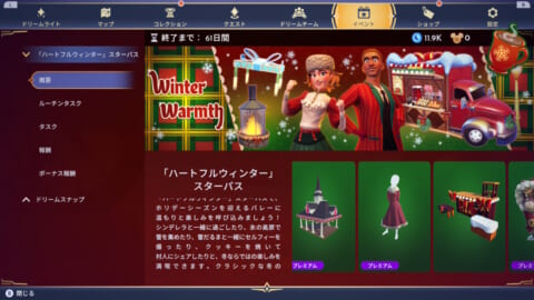 『ディズニードリームライトバレー』の「ハートフルウィンター」スターパスの限定アイテムの入手方法・報酬一覧や、開催されるイベントの詳細などを掲載しています。