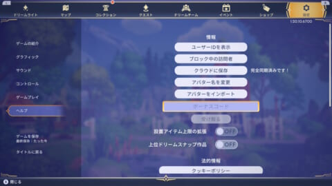 ▼コードを入力する場所はヘルプの「ボーナスコード」の欄です。