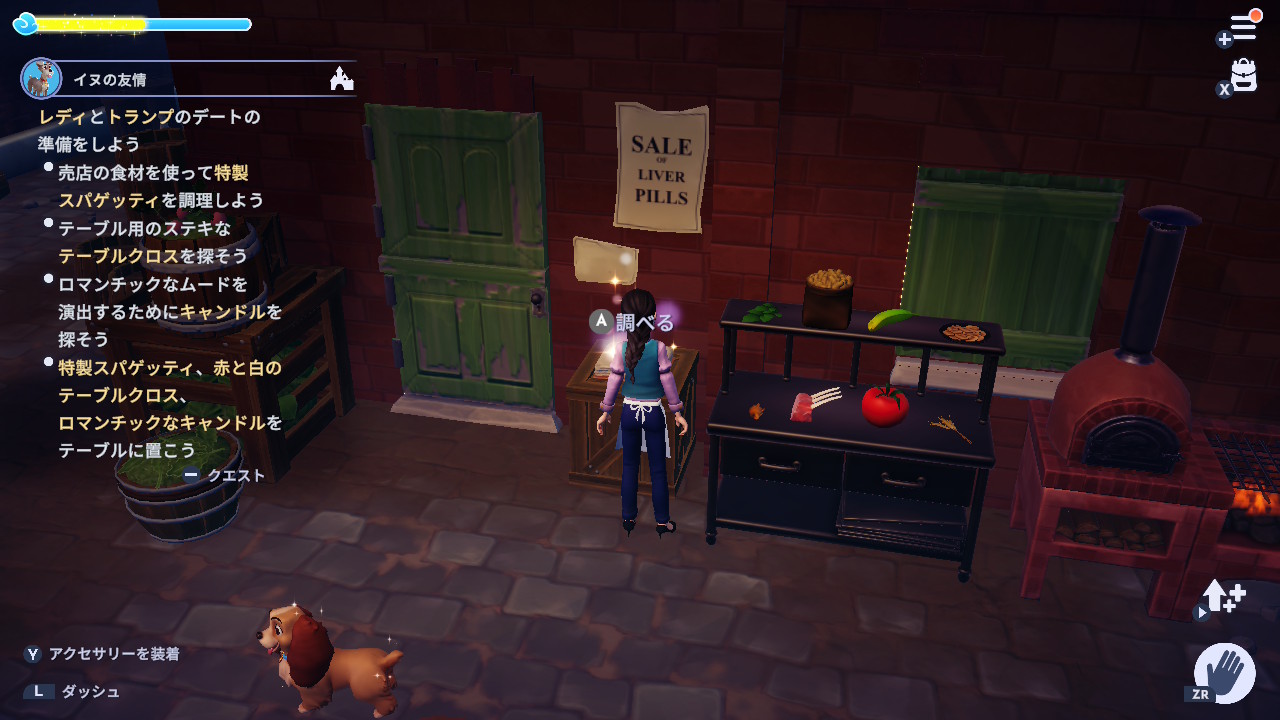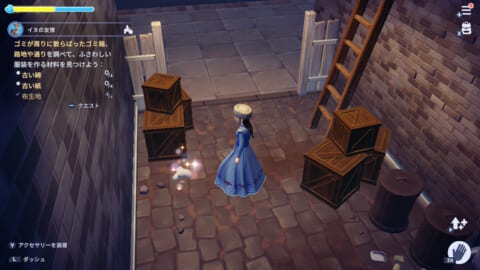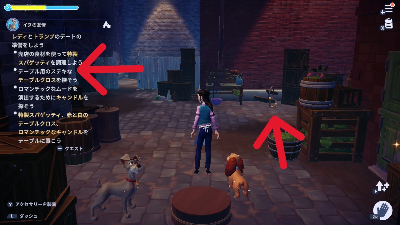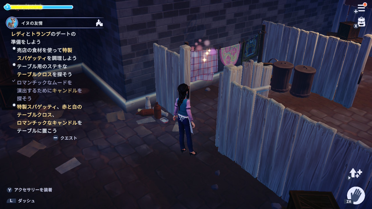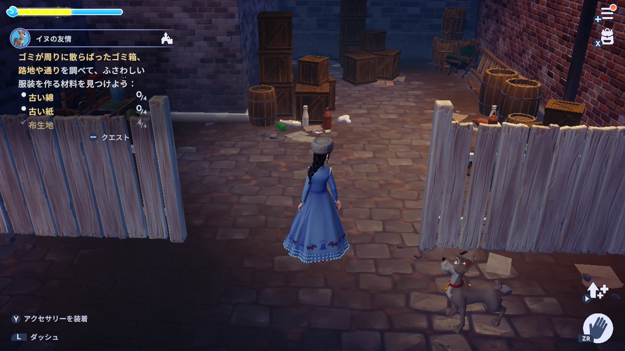 3. 『わんわん物語』の世界の路地や通路で、古い綿×4、古い紙×4、布生地×4を集める