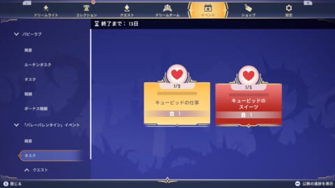 デイリークエストをこなして、タスクの「キューピッドの仕事」「キューピッドのスイーツ」をクリアすると報酬を獲得できます。