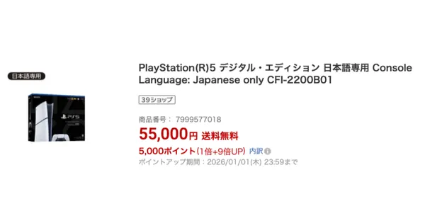 PS5デジタル日本語専用版が楽天ヤマダ電機でポイント10倍
