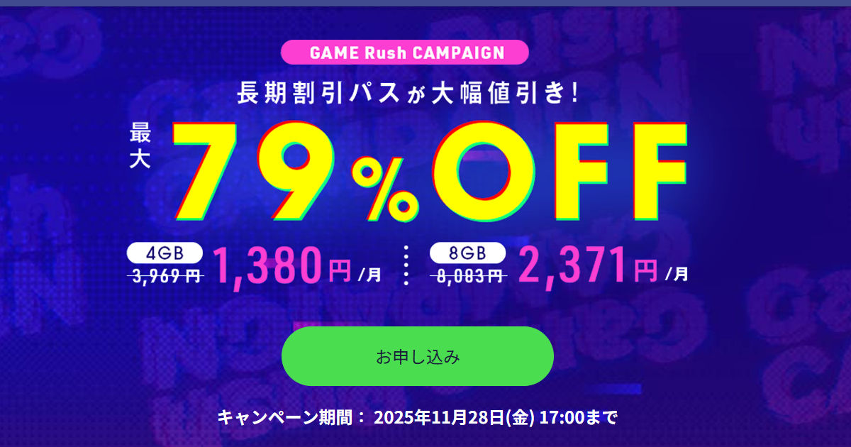 サーバーホスティングサービスの「ConoHa for GAME」では、長期割引パス1ヵ月プランが大幅値引きで利用できる「”GAME Rush” キャンペーン」を10月24日からスタートしました。