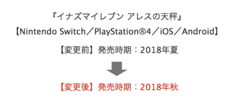 「イナズマイレブン アレスの天秤」の発売時期が 2018年夏 → 2018年秋に変更となりました。