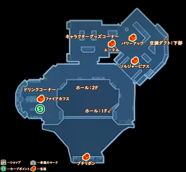 ホールのセーブポイント近く、大きなおもちゃの台座部分 |