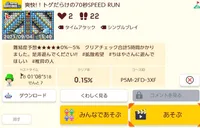 【コース名】爽快!!トゲだらけの70秒SPEED RUN 【コースID】P5M-2FD-3XF 【ゲームスキン】マリオU 【シーンスキン】表…地上 裏…地下 【むずかしさ】0.15%(投稿時) 【タグ】タイムアタック シングルプレイ 【コメント】誰もクリアできないように作ったコースです(クリアされましたが…)。友達の椎茸の人というチャンネルを登録してあげてください。