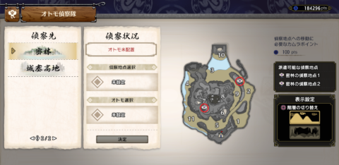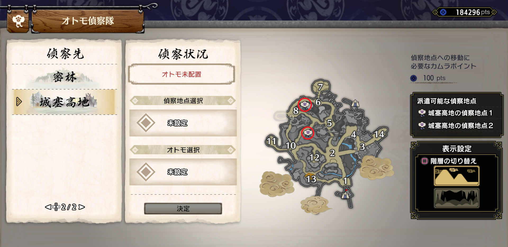 オトモ偵察隊を使用するには、偵察拠点に派遣するオトモまたはガルグ1体とカムラポイント100Ptが必要になります。