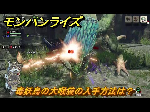 『モンスターハンターライズ』に登場するアイテム「毒妖鳥の大喉袋」の攻略情報を以下で解説しています。