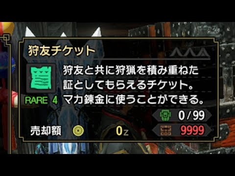 狩友チケット | 狩友と共に狩猟を積み重ねた証としてもらえるチケット。マカ錬金に使うことができる。 |